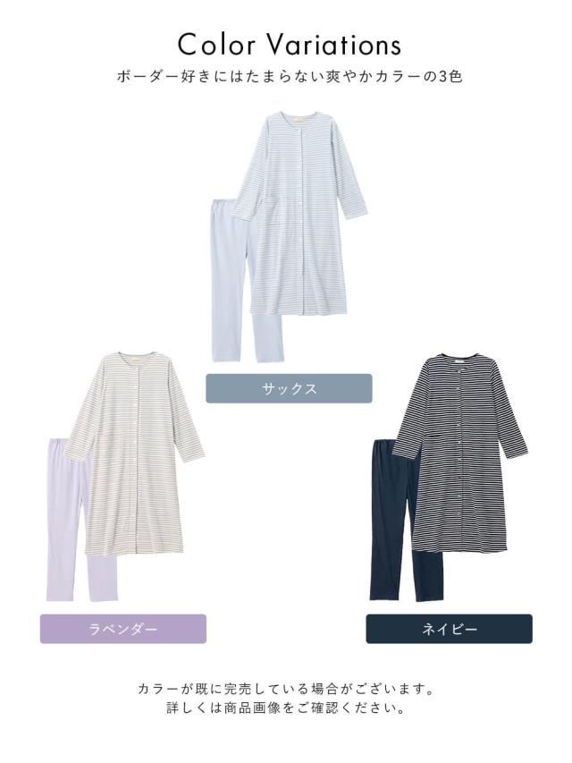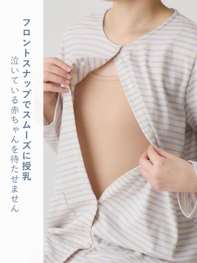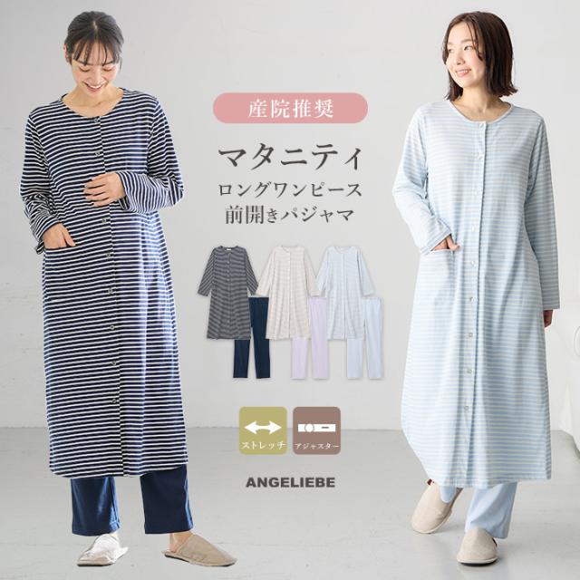 マタニティ パジャマ 前開き 長袖 綿混 ボーダー柄 ロング ワンピース fairy フェアリー 部屋着 ルームウェア パンツ ネグリジェ パープル ブルー ネイビー 柄 妊婦 服 授乳服 授乳 大きいサイズ 産前 産後 臨月 春 夏 秋 かわいい おしゃれ シンプル エンジェリーベ