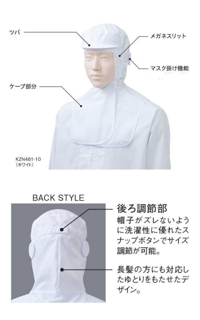 食品工場白衣 フード帽子ケープ付 ツバ有 KZN481 カゼン KAZEN フードファクトリー 衛生帽子 制服 ユニフォーム