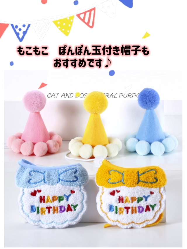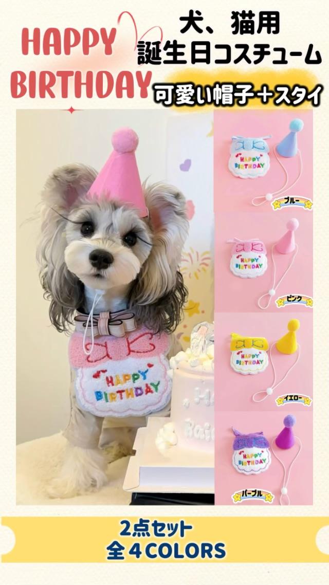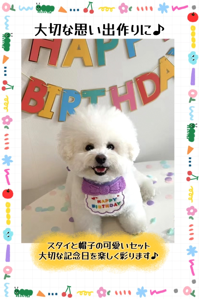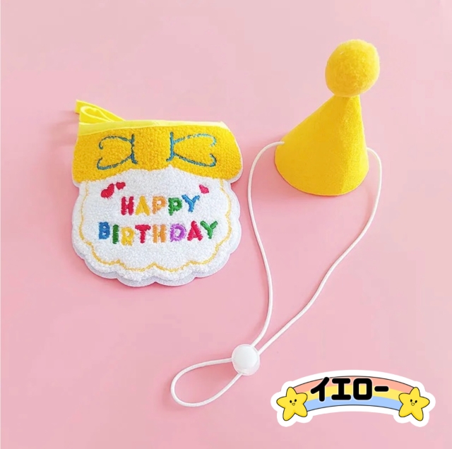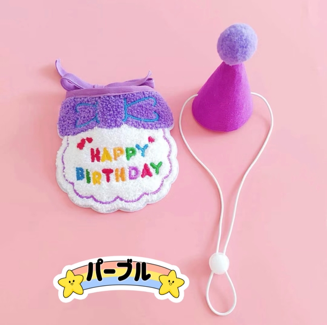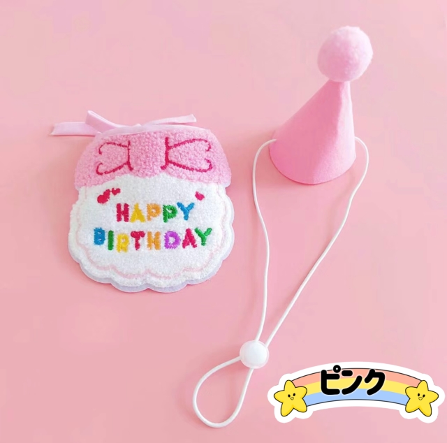 帽子と前掛けがセットになったペット用誕生日グッズです。