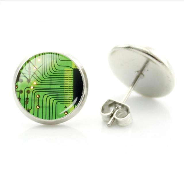 リアルなICチップをデザインした丸いカボションをスタッドピアスにセットしたオモシロくてユニークなファッションピアス。