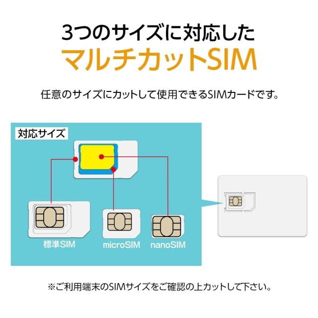 | SIMサイズ | マルチカットSIM ※ご利用端末のSIMサイズをご確認のうえ、切り目に沿ってカットしてください。 |
