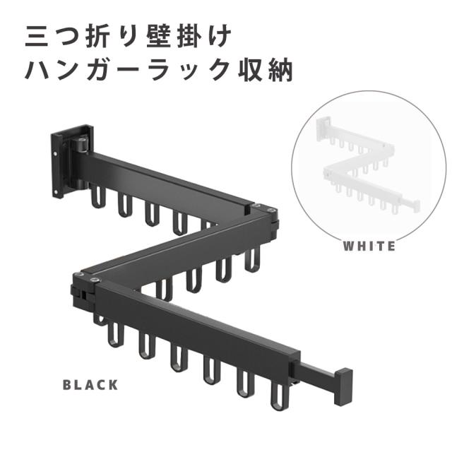 ハンガーラック 壁付け 360度回転 折りたたみ 3段階 壁掛け スリム 省スペース 壁面 折り畳み物干し竿 フック18個 ( ブラック / ホワイト )