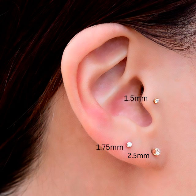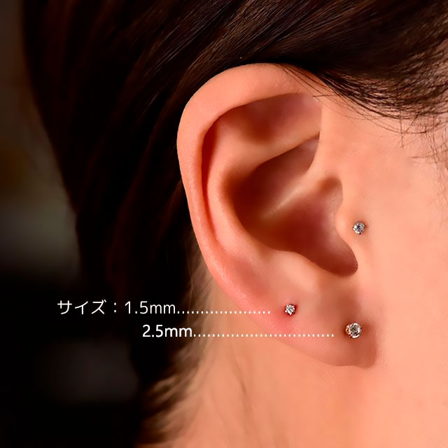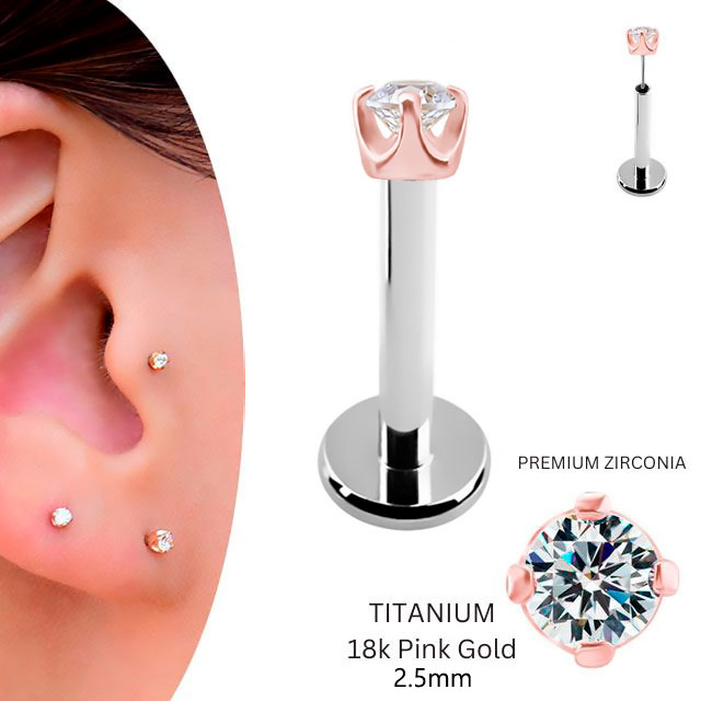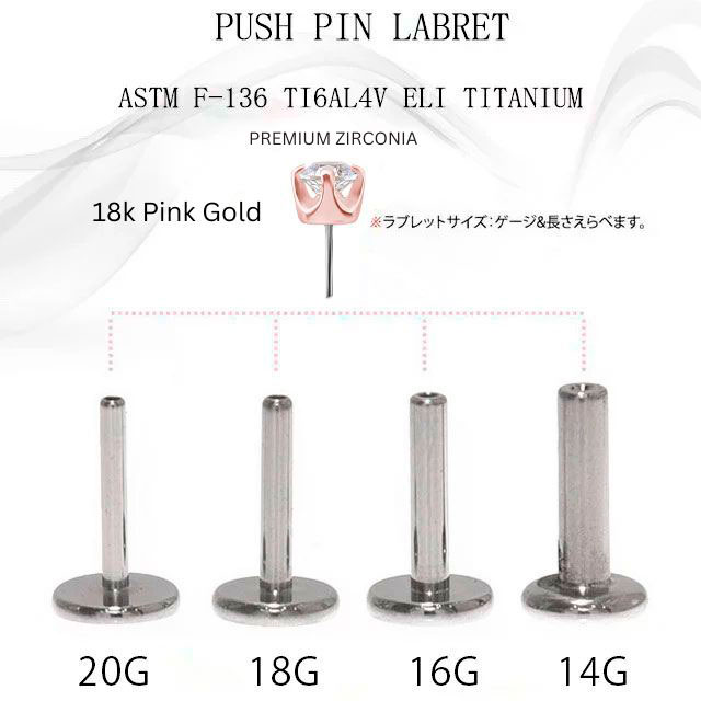 18金 ピンクゴールド 2.5mm 立爪 プッシュ ピアス 20g 18g 16g 14g 18Kゴールド チタンピアス 金属アレルギー対応 ラブレットスタッド ボディピアス ロブ 軟骨ピアス
