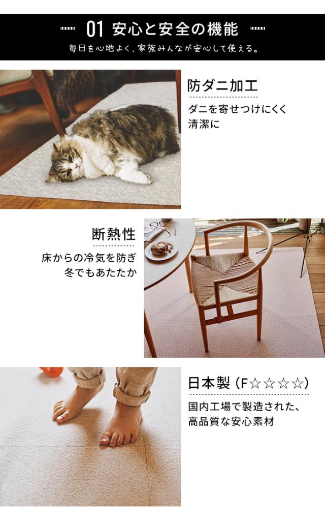 ◆機能:防炎加工、遮音、制電加工、防ダニ加工、手洗いOK、遊び毛無し、床暖OK