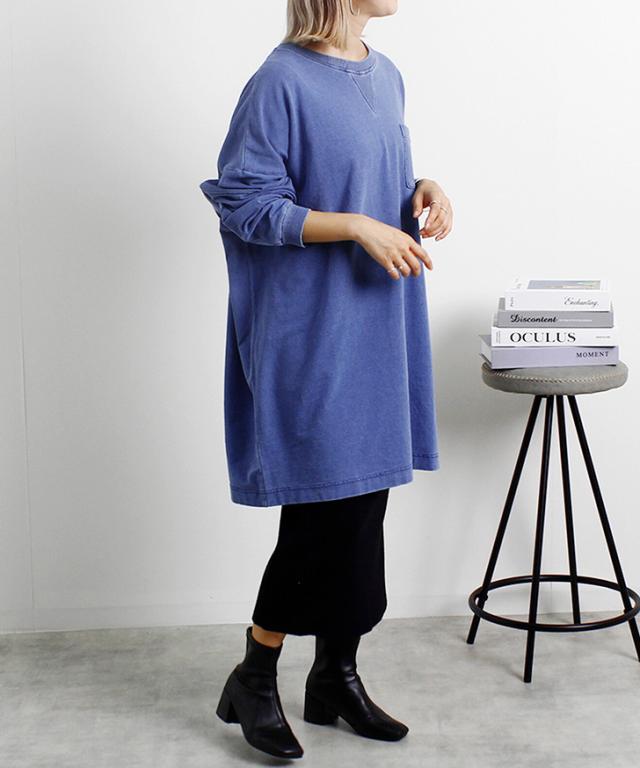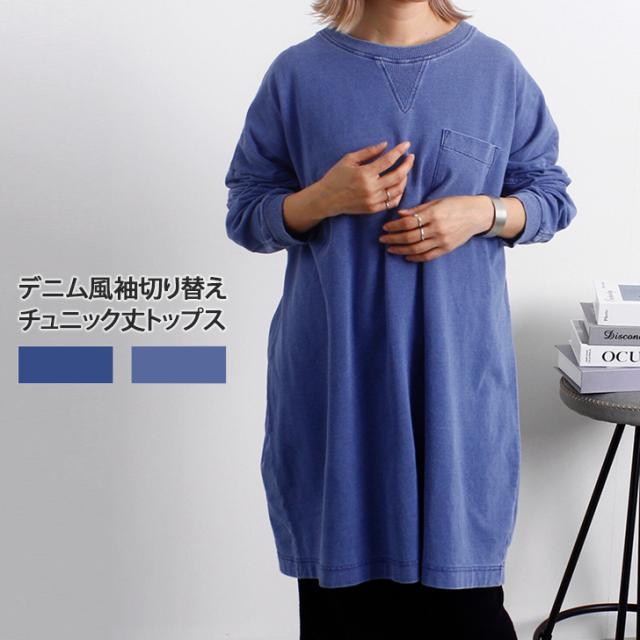 新作 デニム風袖切り替えチュニック丈トップス レディース トップス デニム風 長袖 カジュアル デニム 普段着 普段使い プルオーバー ゆったり 体型カバー ポケット 春 秋 ラウンドネック ナチュラル 快適 無地