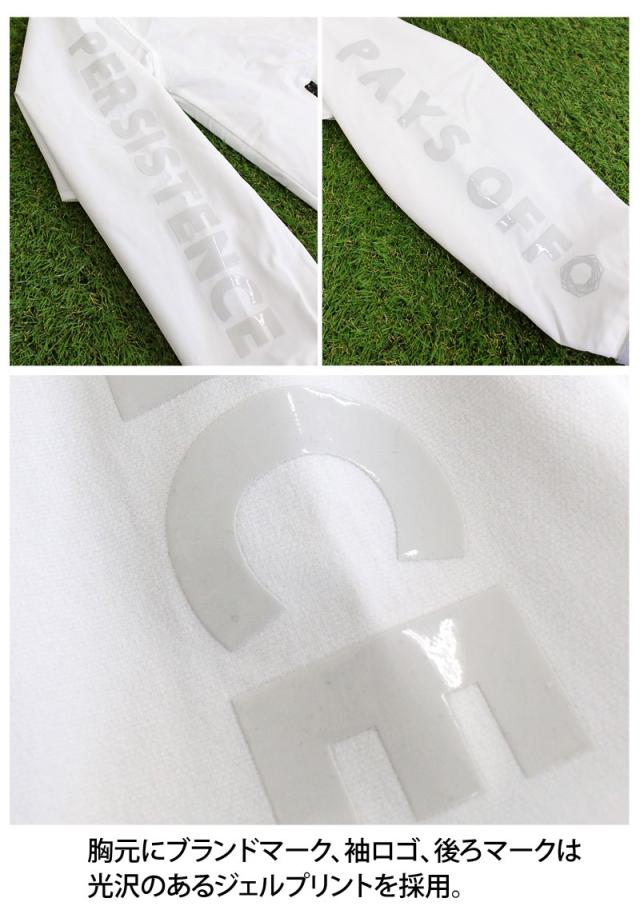 胸元にブランドマーク、袖ロゴ、後ろマークは