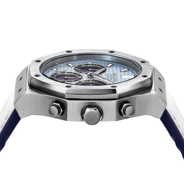 八角形のケースや揃えられたベゼルの鋲など、タフでエッジかつ高級感のあるデザインが特長です。直線的なケースとレザー&ラバーハイブリッドベルトが新しいレベルの一体感を醸成し、エレガントなデザイン性と心地よい着用感の融合を楽しめます。格子状に施されたクルドパリギョーシェと相まって、時間を見るたびに異なる立体的な表情を堪能できます。