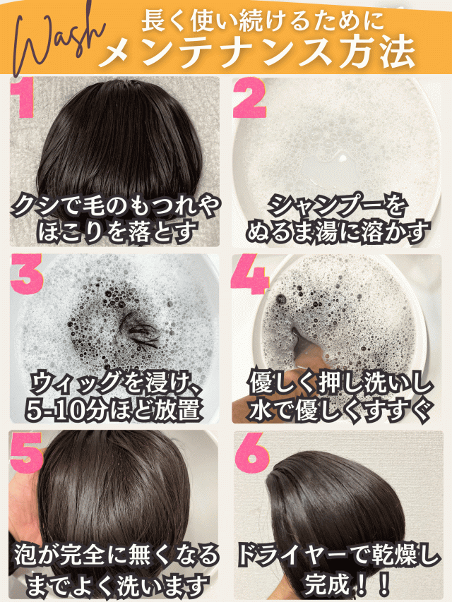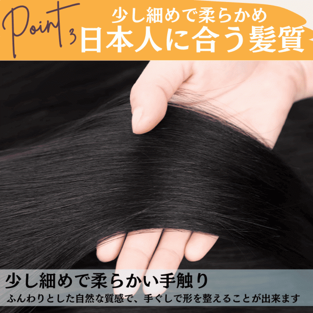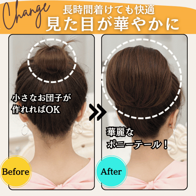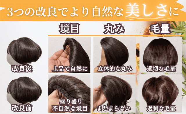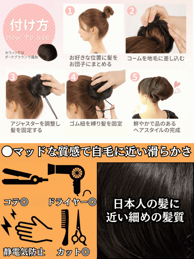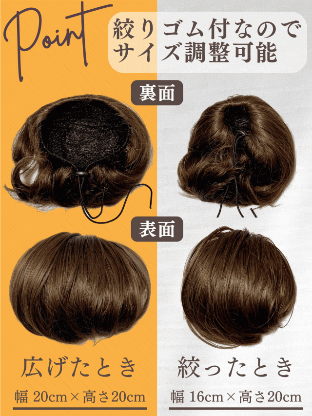 | 特徴3 | 上部1個のコームとサイズ調整ゴム紐で簡単2段階固定。ショートの方でもポニーテールが出来れば使用可能 |