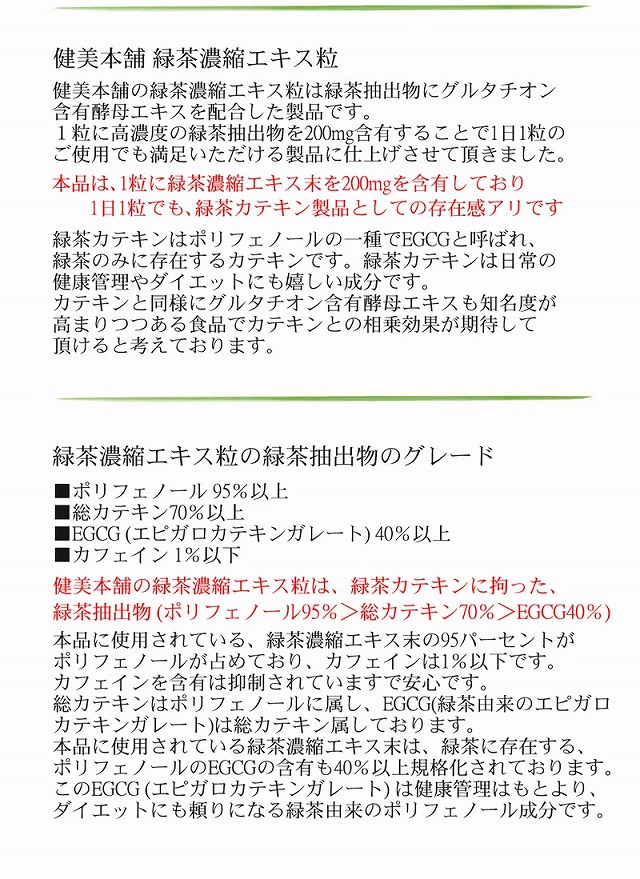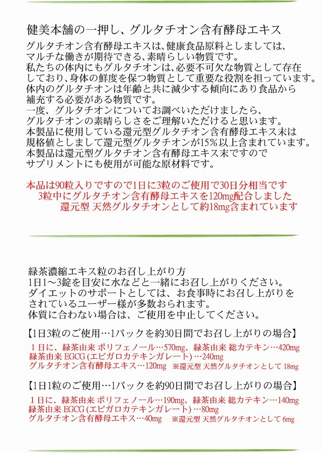 緑茶濃縮エキス(EGCG40%)とグルタチオン含有酵母エキスの粒 緑茶カテキンは、 ダイエットだけでなく、健康管理のサポートに注目の成分です 高濃度の緑茶抽出物 (ポリフェノール95%、カテキン70%、EGCG40%)原料使用 高濃度ポリフェノール含有緑茶抽出物に還元型グルタチオン含有酵母エキスをバランスよく配合しました。 健美本舗 緑茶濃縮エキス粒 健美本舗の緑茶濃縮エキス粒は緑茶抽出物にグルタチオン含有酵母エキスを配合した製品です。 1粒に高濃度の緑茶抽出物を200mg含有することで1日1粒のご使用でも満足いただける製品に仕上げさせて頂きました。 本品は、1粒に緑茶濃縮エキス末を200mgを含有しており1日1粒でもokです 緑茶カテキンはポリフェノールの一種でEGCGと呼ばれ、緑茶のみに存在するカテキンです。緑茶カテキンは日常の健康管理やダイエットにも嬉しい成分です。カテキンと同様にグルタチオン含有酵母エキスも知名度が高まりつつある食品でカテキンとの相乗効果が期待して頂けると考えております。 緑茶濃縮エキス粒の緑茶抽出物のグレード ■ポリフェノール 95%以上 ■総カテキン70%以上 ■EGCG (エピガロカテキンガレート) 40%以上 ■カフェイン 1%以下 健美本舗の緑茶濃縮エキス粒は、緑茶カテキンに拘った、 緑茶抽出物 (ポリフェノール95%>総カテキン70%>EGCG40%) 本品に使用されている、緑茶濃縮エキス末の95パーセントがポリフェノールが占めており、カフェインは1%以下です。カフェインを含有は抑制されていますで安心です。総カテキンはポリフェノールに属し、EGCG(緑茶由来のエピガロカテキンガレート)は総カテキン属しております。本品に使用されている緑茶濃縮エキス末は、緑茶に存在する、ポリフェノールのEGCGの含有も40%以上規格化されております。このEGCG (エピガロカテキンガレート) は健康管理はもとより、ダイエットにも頼りになる緑茶由来のポリフェノール成分です。 健美本舗の一押し、 基礎健康食品 グルタチオン含有酵母エキス グルタチオン含有酵母エキスは、健康食品原料としましては、マルチな働きが期待できる、素晴らしい物質です。私たちの体内にもグルタチオンは、必要不可欠な物質として存在しており、身体の鮮度を保つ物質として重要な役割を担っています。体内のグルタチオンは年齢と共に減少する傾向にあり食品から補充する必要がある物質です。一度、グルタチオンについてお調べいただけましたら、グルタチオンの素晴らしさをご理解いただけると思います。 本製品に使用している還元型グルタチオン含有酵母エキス末は規格値としまして還元型グルタチオンが15%以上含まれています。本製品は還元型グルタチオン含有酵母エキス末ですのでサプリメントにも使用が可能な原材料です。 本品は90粒入りですので1日に3粒のご使用で30日分相当です。 3粒中にグルタチオン含有酵母エキスを120mg配合しました。 還元型 天然グルタチオンとして約18mg含まれています |