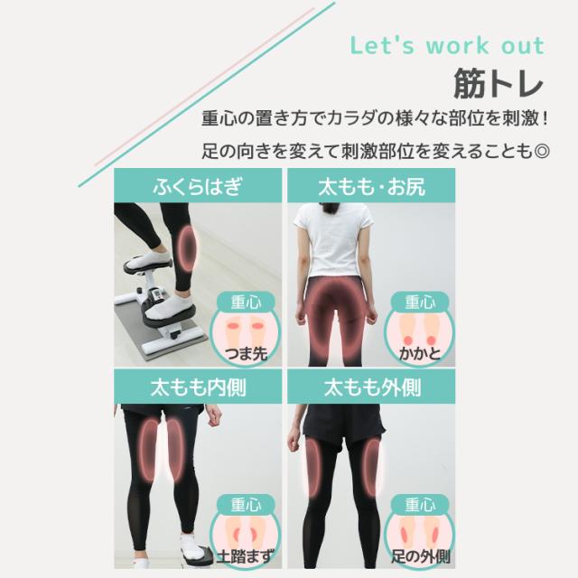 上下運動をすることにより、階段登り運動ができ、気になる下半身を引き締め、全身の体力向上にもつながります。
