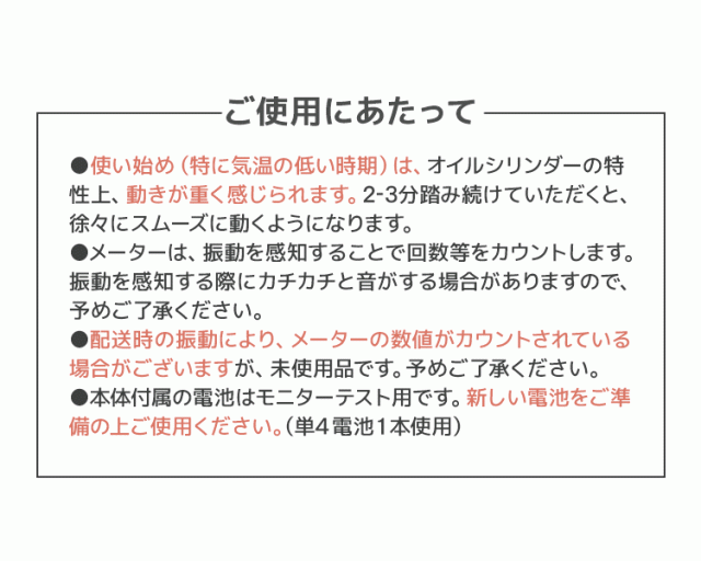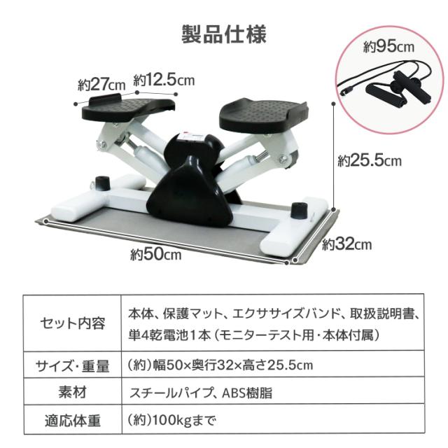 | 内容 | 本体 ×1 保護マット ×1 エクササイズバンド ×2 日本語取扱説明書 単4乾電池 ×1(モニターテスト用・本体付属) |