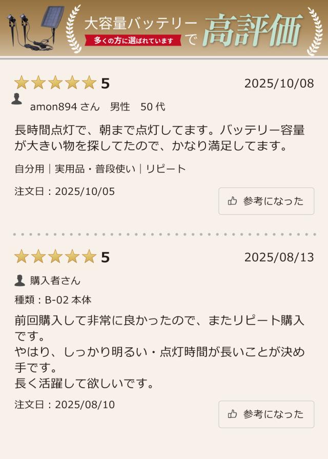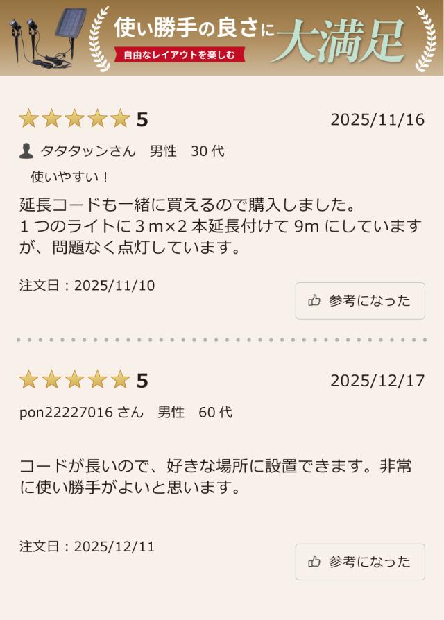 - ガーデンライトを取り付け、暗くなるのを待って点灯したところライトの明るさ、照らし出された所の雰囲気は自分のイメージどおりでした。 あとは長く使える耐久性に期待しています。 注文番号:705910923