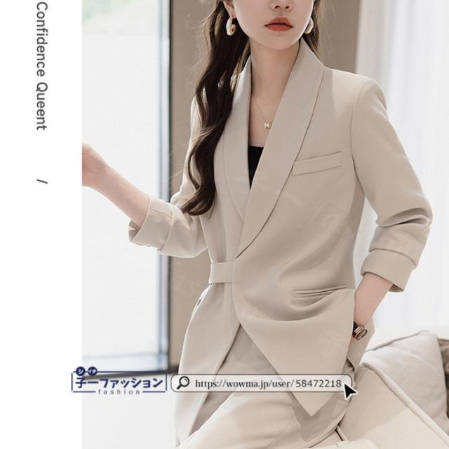 ベーシックなデザインで着回し力抜群な2点セットのパンツスーツ。