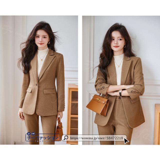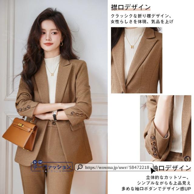 ベーシックなデザインで着回し力抜群な2点セットのパンツスーツ。