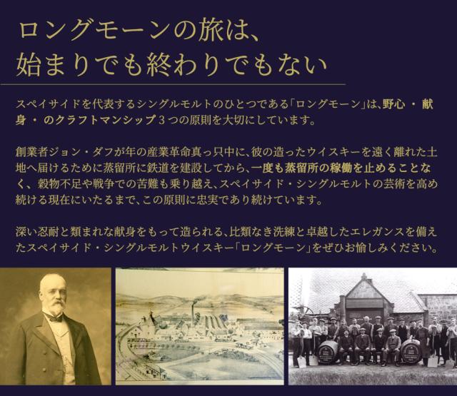 【18年以上熟成】全てのポートフォリオで長期熟成された希少価値の高い製品のみがリリースされる、品格あるブランドです。 【厳選されたアメリカンオーク樽を使用】 ロングモーン蒸留所の素晴らしいスピリッツを最大限に活かし、スペイサイドスタイルを究極まで表現するために、厳選されたアメリカンオーク樽とホグスヘッド樽を使用しています。 【シングルバッチ&アニュアル・リリース】年に一度のみボトリングされ(シングルバッチ )、毎年新しいバッチが発売される(アニュアル・リリース)、コレクション価値の非常に高いウイスキーです。 【カスクストレングス&ノン・チルフィルタード】 カスクストレングス(加水をせず樽出しそのままのアルコール度数)、冷却濾過をしないノン・チルフィルタード製法を採用し、極めてピュアなスタイルのウイスキーに仕上げました。 【テイスティングノート】香り:マダガスカル産バニラ、クリーミーなトフィー、ヘーゼルナッツのプラリネが、フルーティーなレモンシャーベット、ピリッとしたオレンジの皮、シロップ漬けのポーチドペアーと複雑に絡み合う。 味わい:バニラボンボン、ビクトリア・スポンジケーキ、ハチミツの花の香りに、果樹園のフルーツとフィレンツェ風ビスケットが幾重にも重なる。 フィニッシュ:甘くなめらかな、長い余韻。 | ![]() ■度数:54.5% ■内容量:700ml 世界の蒸留家から、“私が造るウイスキーを除けば、ロングモーンは私が最もお気に入りのウイスキーだ。”と、敬愛され続けている世界屈指の品質と評されている1894年創業!! 歴史あるスペイサイド、エルギン地区にあるロングモーン蒸溜所!!時代を先取りする考えの持ち主であった創業者ジョン・ダフ氏によって設立!! モルトはブレンダーからブレンド用の“トップドレッシング”として非常に人気で、ブレンデッドウイスキー、シーバスリーガルやロイヤルサルートなどの原酒として使われています!! ロングモーンは“スペイサイドの隠れた宝石”と呼ばれる人気モルト!!そんなロングモーンより洗練されたスペイサイドのクラシックスタイル、より一層豊かで深い味わいのシングルモルト!!ロングモーン22年!!ぜひご賞味ください!! |