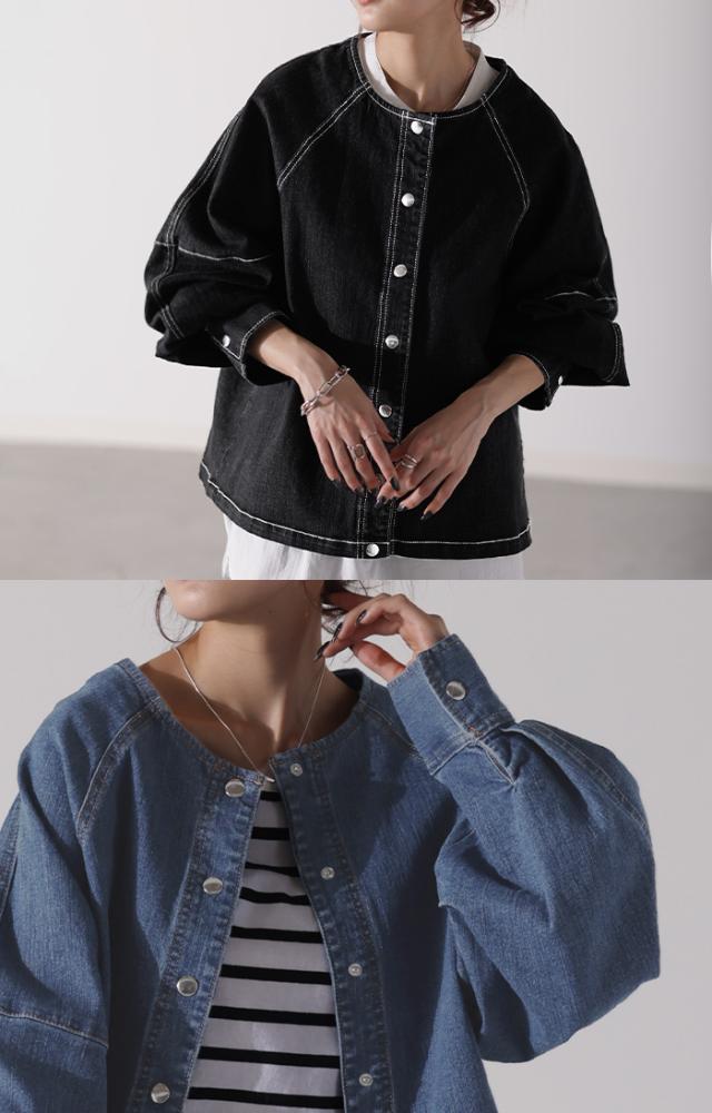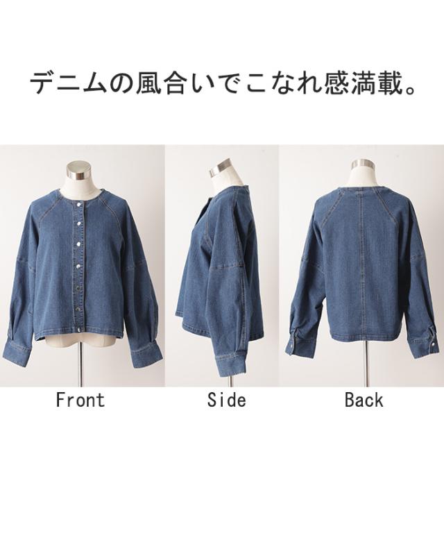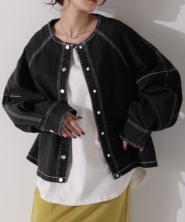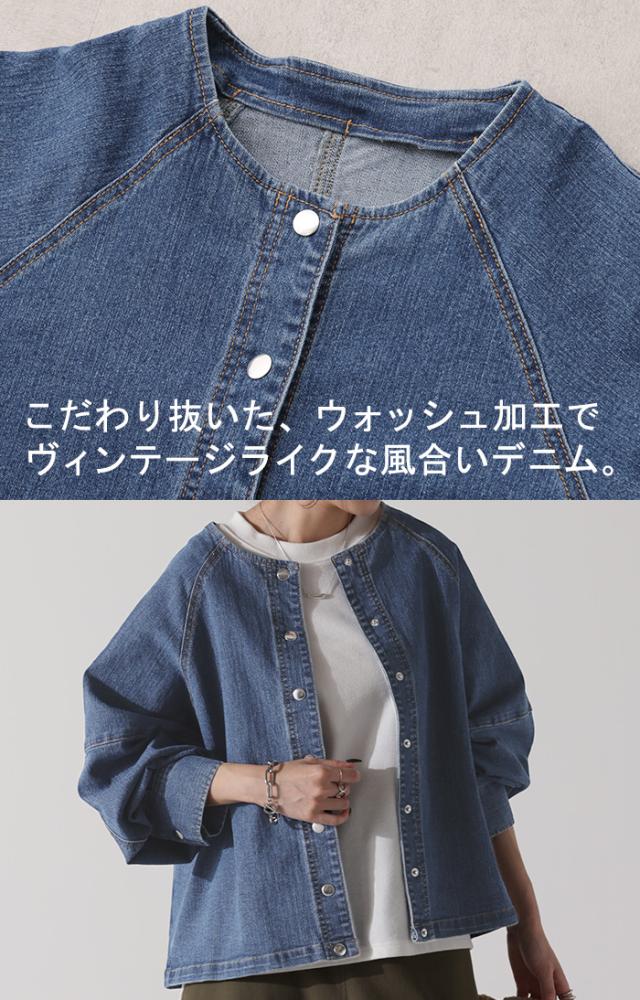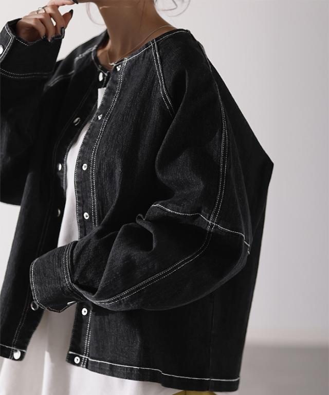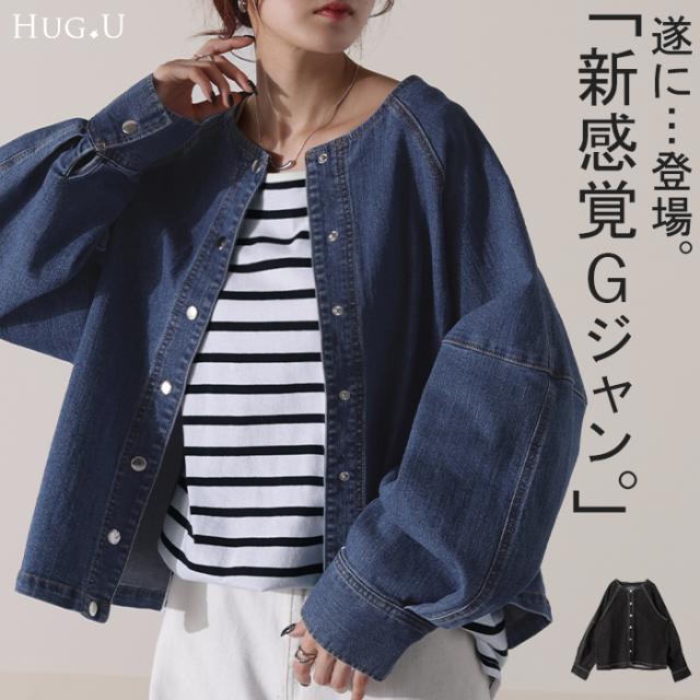 Gジャン コンパクト目 新感覚 デニム アウター デニムジャケット レディース デニムシャツ トップス ジャケット ブルゾン 長袖 羽織 ノーカラー 大人 ゆったり ダメージ ジーンズ 伸びる ストレッチ 体型カバー お洒落 ステッチ 黒 春 冬 HUG.U 秋新作