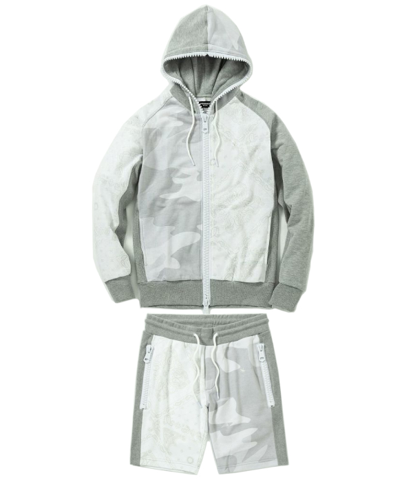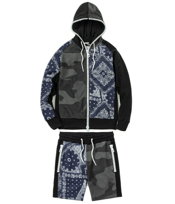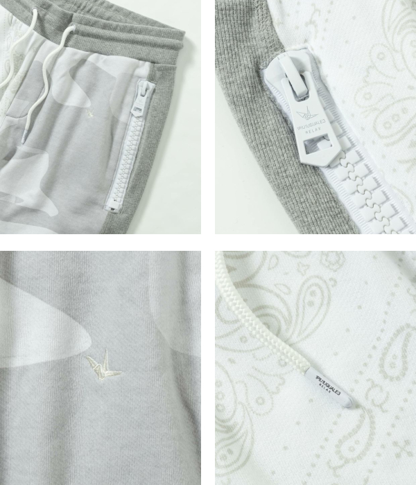 人気のカモ柄×ペイズリーで大胆に切り替えたセットアップ。キャッチーなビッグファスナーがさらに遊び心あるアクセントをプラスします。柔らかなスウェット素材を採用した心地よい肌触りも魅力。