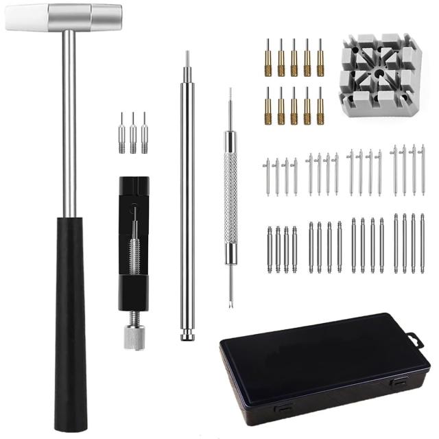 ・2. 時計工具セット内容:ハンマー 1本、時計 ベルト固定台座 1個、コマはずし 1個 スペアピン3本 、バネ棒はずし 1本、パンチ針 1本装備スペアニードル 10