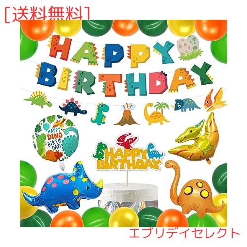 ?【セット内容】?アルミバルーン:恐竜 x3、 ラウンド x1 ?ゴムバルーン:ダークグリーン x5、オレンジ x5、イエロー x5、グリーン x5 ?「Happy Birthday」レターバナー x1 ?恐竜ガーランド x1 ?ケーキトッパー x1 ?その他アクセサリー:風船クリップ x1、ストロー x2、両面シールセット x1(接着ドット20個)