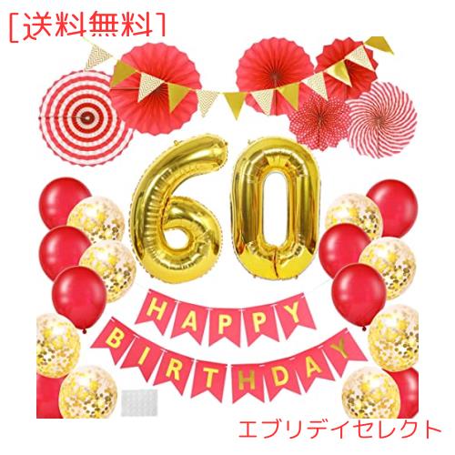 ◆商品名:還暦祝い 60歳 数字バルーン 誕生日 飾り付け 大きい 風船 HAPPY BIRTHDAY 赤とゴールド 紙吹雪風船 大人 ペーパーファン 女性 男性 デコ