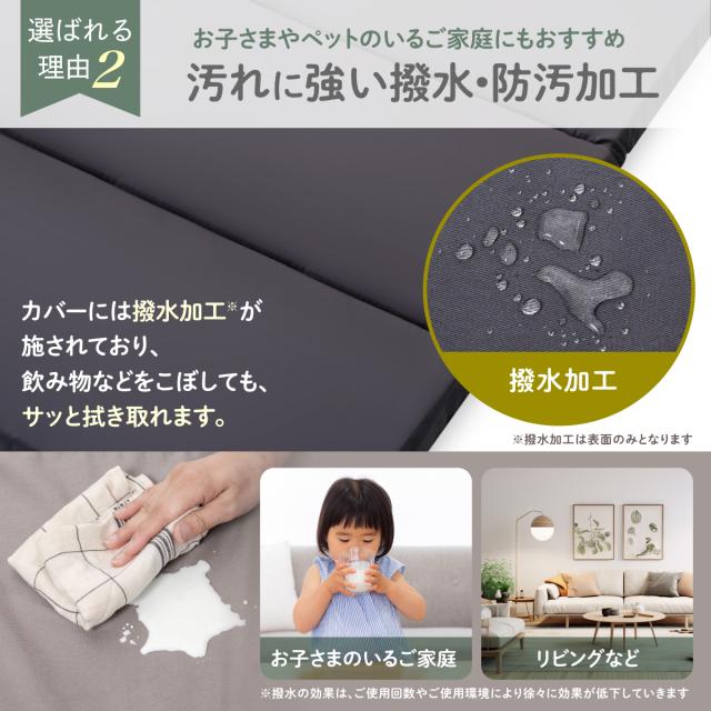 汚れに強い高耐久ツイル生地を採用。撥水加工付きなので、人が集まるリビングでの食べこぼしもサッとふき取れます。ペットや小さなお子様がいてもメンテナンスが楽々。