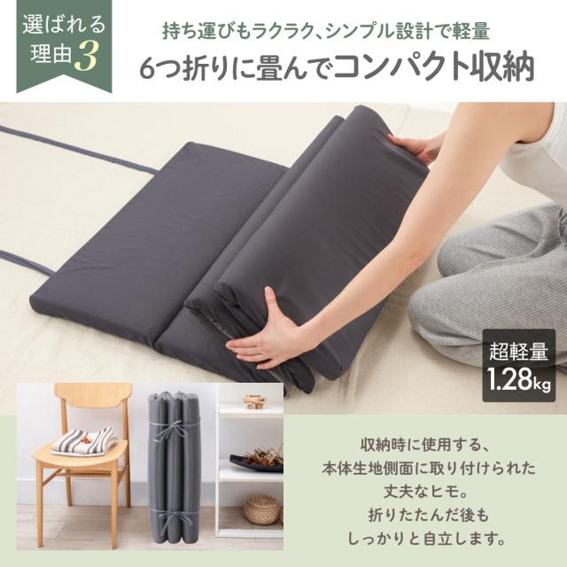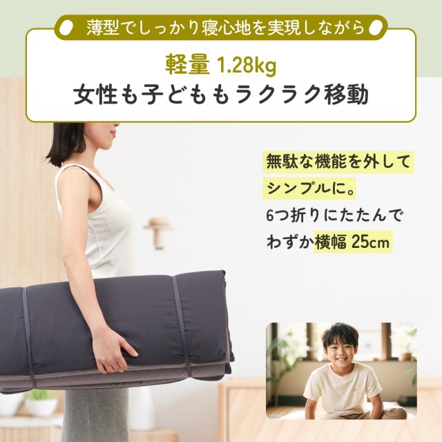 軽量1.28kgで女性や子供でも持ち運びラクラク!6つ折りに折り畳めば、シングルの3つ折りマットレスの半分ほどのスペースでコンパクトに簡単収納。自立するため車や押し入れといった狭い空間にも簡単に入ります。来客用やミニマリスト生活に。1家に1枚あると安心です。