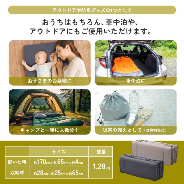 マットレスとしてはもちろん、薄型だから長座布団のようにも使えます。滑り止め加工付だから寝返りによるズレが気になりません。大人だけでなく、お子様との添い寝やお昼寝にもピッタリ。またキャンプなどのアウトドアをはじめ、防災用や車中泊でのご利用もおすすめです。