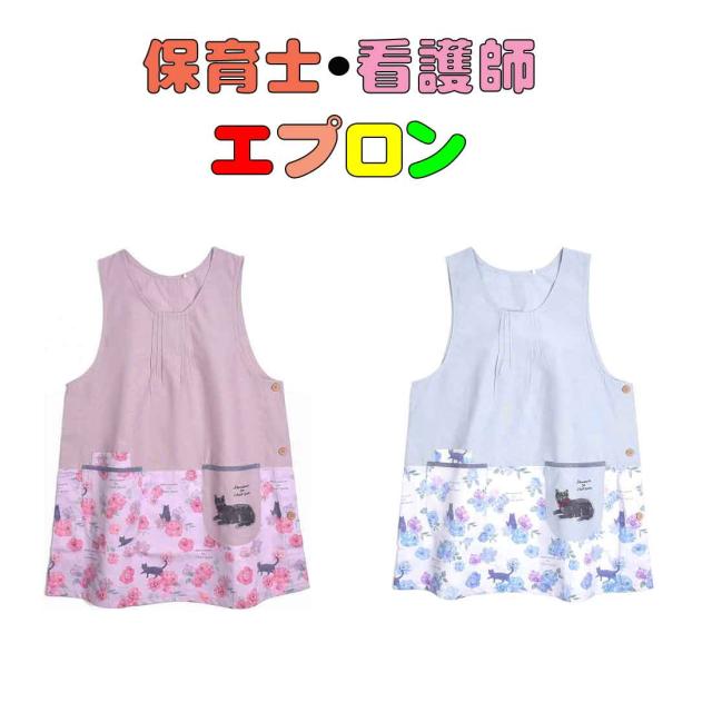 保育士 看護師 介護士 エプロン 黒猫ムッシュ君柄 ピンク ブルー 幼稚園 保育園 小学校 介護施設