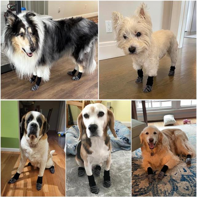 - シニア犬で初の靴下でしたが嫌がらずに履いてくれてます。マジックバンドで止められるので脱げずに快適そうです。発送も早くて助かりました。ありがとうございます。