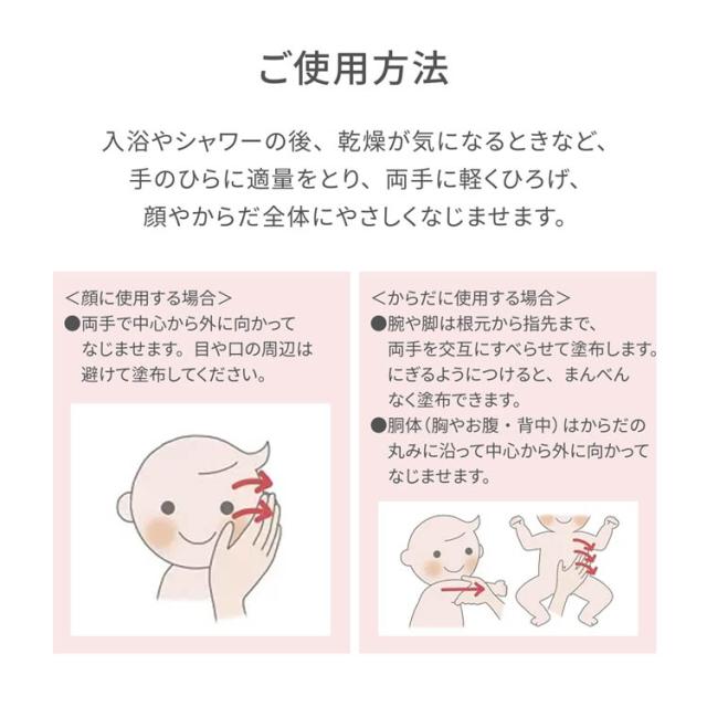 ・入浴やシャワーの後、乾燥が気になるときなど、手のひらに適量をとり、両手に軽くひろげ、顔やからだ全体にやさしくなじませます。