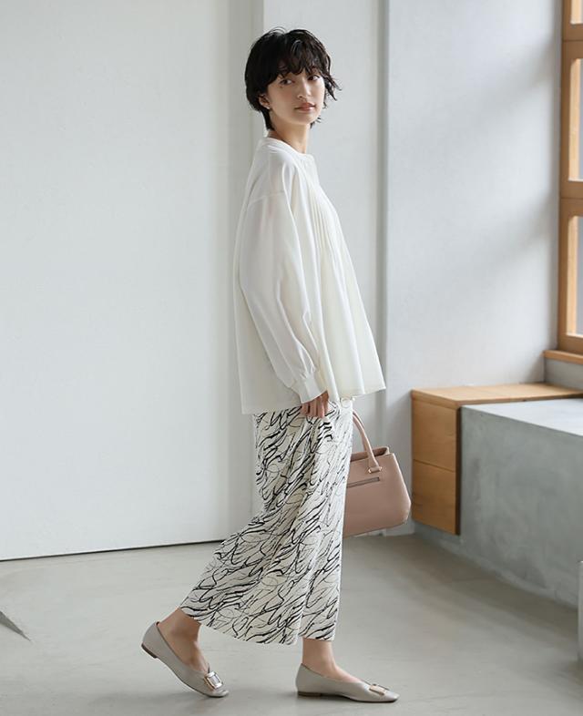 ![]() ![]() ![]() ![]() ![]() ![]() ![]() ![]() ![]() ![]() ![]() ![]() ![]() ![]() ![]() ![]() ![]() ![]() ![]() ![]() ■Comment 『きちんと見える、ゆったりブラウス。』 胸元にピンタックを入れた、ふわっと広がるデザイン。 首元がスッキリ見えるスキッパーネックと、 ボリュームのある袖で女っぽく仕上げました。 伸縮性がある生地なので着やすく、お手入れしやすいのもポイント。 普段使いからオケージョンまで活躍してくれるアイテムです。 ■Size(cm) 【M】:着丈66 バスト117 肩幅54 袖丈50 袖口20 天幅18 前下がり14 裾周り144 【L】:着丈67 バスト117 肩幅55 袖丈51 袖口22 天幅18 前下がり14 裾回り150 ■Fabric ポリエステル96% ポリウレタン4% 生地感:さらっとした、シボ感と伸縮性のある梨地生地 裏地:なし 伸縮性:あり 透け感:若干あり ※オフホワイトは有り 生地の厚さ:普通 ■Weight M:約290g L:約300g ■Color オフホワイト(黄みがかった白) ブラック(標準的な黒) スモーキーブルー(くすんだ暗めのブルー) グレージュ(グレーがかった暗めのベージュ) ■Country of origin 中国 ■洗濯表示