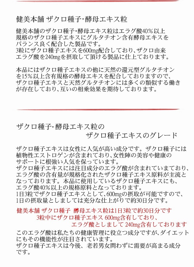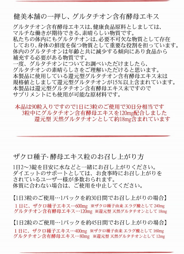 ザクロ種子濃縮エキス(エラグ酸40%)とグルタチオン含有酵母エキスの粒 ザクロ種子は美容・ダイエット・健康のサポートに注目のマルチ成分です ザクロ種子ポリフェノールと天然グルタチオンで身体の鮮度は抜群です ザクロ種子に含まれるのエラグ酸に還元型グルタチオン含有酵母エキスをバランスよく配合しました。 ザクロ種子・酵母エキス粒 健美本舗のザクロ種子・酵母エキス粒はエラグ酸40%以上規格のザクロ種子エキスにグルタチオン含有酵母エキスをバランス良く配合した製品です。 3粒にザクロ種子エキスを600mg配合しており、ザクロ由来エラグ酸を240mgを摂取して頂ける製品に仕上ております。 本品にはザクロ種子エキスの他に天然の還元型グルタチオンを15%以上含有規格の酵母エキスを配合しておりますので、ザクロ種子エキスと天然グルタチオンには多くの類似する働きが存在しており、互いの相乗効果を期待しております。 ザクロ種子・酵母エキス粒のザクロ種子エキスのグレード ザクロ種子エキスは女性に人気が高い成分です。ザクロ種子には植物性エストロゲンが含まれており、女性陣の美容や健康のサポートに根強い人気を保っています。 ザクロ種子エキスには注目成分のエラグ酸が含まれていまており、エラグ酸の含有量が規格化されたザクロ種子エキス原料が主流となっております。本品に使用しているザクロ種子エキスにも、エラグ酸40%以上の規格原料となっております。 1日3粒でザクロ種子エキスとして、600mgの摂取が可能ですので、1日の摂取量としましては充分な仕上がりで約30日分です。 健美本舗 ザクロ種子・酵母エキス粒は1日3粒で約30日分です 3粒中にザクロ種子エキス600mg含有、エラグ酸として240mg含有しております このエラグ酸は私たちの健康管理に役立つ成分ですが、ダイエットにもその機能性が注目されています。ザクロ種子エキスは今後、老若男女問わずに需要が高まる成分です。 健美本舗の一押し、 基礎健康食品 グルタチオン含有酵母エキス グルタチオン含有酵母エキスは、健康食品原料としましては、マルチな働きが期待できる、素晴らしい物質です。私たちの体内にもグルタチオンは、必要不可欠な物質として存在しており、身体の鮮度を保つ物質として重要な役割を担っています。体内のグルタチオンは年齢と共に減少する傾向にあり食品から補充する必要がある物質です。一度、グルタチオンについてお調べいただけましたら、グルタチオンの素晴らしさをご理解いただけると思います。 本製品に使用している還元型グルタチオン含有酵母エキス末は規格値としまして還元型グルタチオンが15%以上含まれています。本製品は還元型グルタチオン含有酵母エキス末ですのでサプリメントにも使用が可能な原材料です。 本品は90粒入りですので1日に3粒のご使用で30日分相当です 3粒中にグルタチオン含有酵母エキスを120mg配合しました 還元型 天然グルタチオンとして約18mg含まれています |