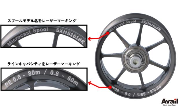 スプール側面に判別用の「モデル名」「ラインキャパシティ」をレーザーマーキングにて施しております。