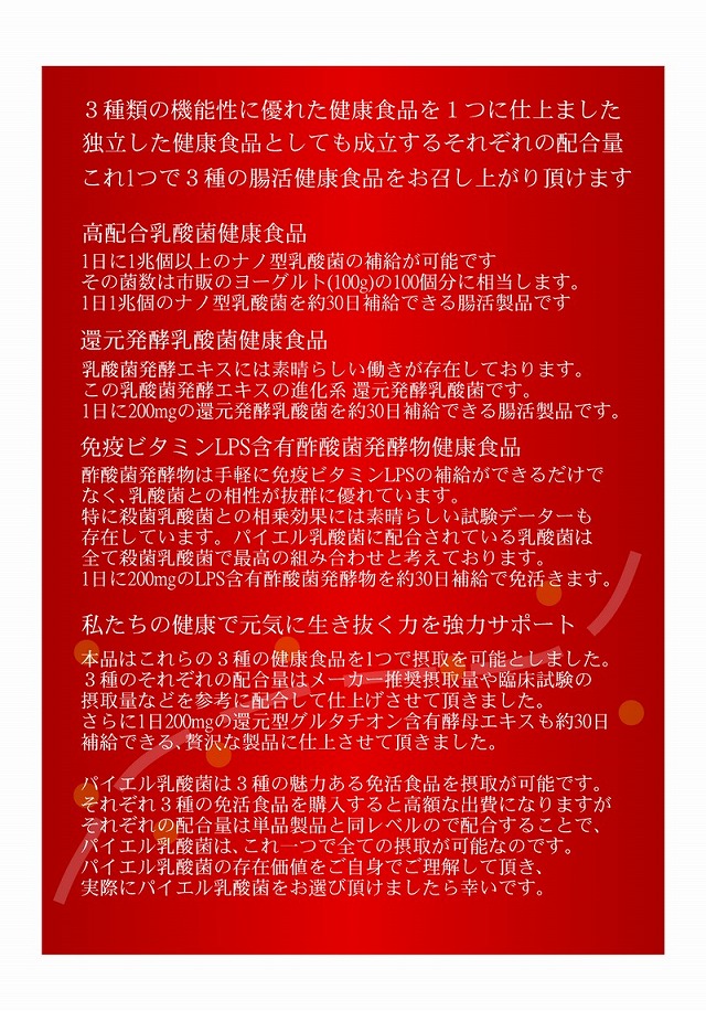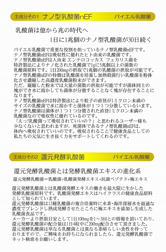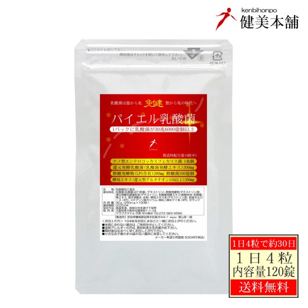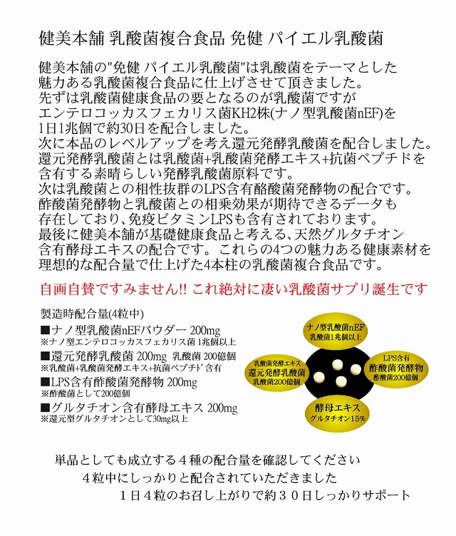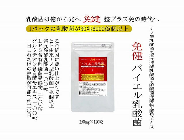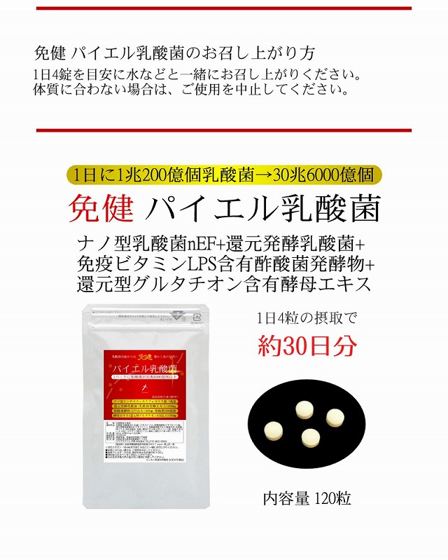 免健 パイエル乳酸菌 充実の30日、1日1兆200億個以上(100gのヨーグルトの100個分相当)の乳酸菌→ナノ型乳酸菌+還元発酵乳酸菌+免疫ビタミンLPS含有酢酸菌発酵物+還元型グルタチオン含有酵母エキス 120粒