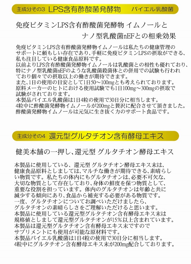 乳酸菌は億から兆へ 免健 整プラス免の時代へ 1日に1兆200億個以上の乳酸菌を食す、約30日間 1パックに乳酸菌が30兆6000億個以上 ナノ型乳酸菌+還元発酵乳酸菌+酢酸菌発酵物+酵母エキス 還元型グルタチオン含有酵母エキス配合 乳酸菌複合食品 免健 パイエル乳酸菌 健美本舗の"免健 パイエル乳酸菌"は乳酸菌をテーマとした魅力ある乳酸菌複合食品に仕上げさせて頂きました。先ずは乳酸菌健康食品の要となるのが乳酸菌ですがエンテロコッカスフェカリス菌KH2株(ナノ型乳酸菌nEF)を1日1兆個で約30日を配合しました。 次に本品のレベルアップを考え還元発酵乳酸菌を配合しました。還元発酵乳酸菌とは乳酸菌+乳酸菌発酵エキス+抗菌ペプチドを含有する素晴らしい発酵乳酸菌原料です。 次は乳酸菌との相性抜群のLPS含有酪酸菌抽出物の配合です。 酢酸菌発酵物と乳酸菌との相乗効果が期待できるデータも存在しており、免疫ビタミンLPSも含有されております。 最後に健美本舗が基礎健康食品と考える、天然グルタチオン含有酵母エキスの配合です。これらの4つの魅力ある健康素材を理想的な配合量で仕上げた4本柱の乳酸菌複合食品です。 自画自賛ですみません!! これ絶対に凄い乳酸菌サプリ誕生です 免健 パイエル乳酸菌の製造時配合量(4粒中) ■ナノ型乳酸菌nEFパウダー 200mg ※ナノ型エンテロコッカスフェカリス菌 1兆個以上 ■還元発酵乳酸菌 200mg ※乳酸菌+乳酸菌発酵エキス+抗菌ペプチド含有 ■LPS含有酢酸菌発酵物 200mg ※酢酸菌として200億個 ■グルタチオン含有酵母エキス 200mg ※還元型グルタチオンとして30mg以上 単品としても成立する4種の配合量を確認してください。 4粒中にしっかりと配合されていただきました。 1日4粒のお召し上がりで約30日しっかりサポート 主成分その1 ナノ型乳酸菌nEF 乳酸菌は億から兆の時代へ…1日に1兆個のナノ型乳酸菌が30日続く パイエル乳酸菌で重要な役割を担っているナノ型乳酸菌nEFです。 ナノ型乳酸菌nEFは吸収性に優れたヒト由来の乳酸菌です。 ナノ型乳酸菌nEFは人由来 エンテロコッカス・フェカリス菌を特許製法によりナノ化された乳酸菌で1gに5兆個以上の菌数の乳酸菌原料です。1日200mgの摂取で1兆個の乳酸菌の摂取が可能です。 ナノ型乳酸菌nEFの特徴は乳酸菌を培養し加熱殺菌行い乳酸菌を粉体化させ濃縮した高濃度乳酸菌粉末ができます。ただ、凝縮した粉末では大量の菌数の摂取が可能ですが菌体同士の塊ができ水に溶かしても菌体が分散することなく塊が存在することになります。 ナノ型乳酸菌nEFは特許製法により粒子の直径が1ミクロン未満のサイズの乳酸菌で水に溶かすと菌体が1つ1つ分散しているいます。ナノ型乳酸菌は菌体が1つ1つ分散された直径1ミクロン未満の乳酸菌なので吸収性に優れているのです。 「えっ!乳酸菌って吸収されていいの?」と思われるユーザー様も少なくないと思われますが、死菌体であるナノ型乳酸菌nEFは、体内へ吸収されていいのです。吸収されることで健康食品としての私たちの元気に生き抜く力をサポートしてくれるのです。 主成分その2 還元発酵乳酸菌 還元発酵乳酸菌とは発酵乳酸菌エキスの進化系 還元発酵乳酸菌=乳酸菌+乳酸菌発酵エキス+抗菌ペプチド+梅エキス 還元発酵乳酸菌とは乳酸菌発酵エキスの働きを最大限に生かした発酵乳酸菌原料です。乳酸菌発酵エキスはハイクラスの健康食品原料として知られています。 還元発酵乳酸菌は12種乳酸菌の複合培養時に水素・海洋深層水を最適な濃度でブレンドし熟成発酵させたところに梅エキスを添加し生成した乳酸菌食品です。 メーカーより摂取目安として1日100mgを1〜3回との情報を頂いており、還元発酵乳酸菌の配合量は1日4粒中に200mg配合させて頂きました。 還元発酵乳酸菌は単なる乳酸菌とは異なる素晴らしい食性を持っておりますので、ご興味をお持ちになられましたら、還元発酵乳酸菌でネット検索をお願いします。 主成分その3 LPS含有酢酸菌発酵物 免疫ビタミンLPS含有酢酸菌発酵物イムノールはナノ型乳酸菌nEFとの相乗効果 免疫ビタミンLPS含有酢酸菌発酵物イムノールは私たちの健康管理のサポートに頼もしい存在であり、手軽に免疫ビタミンLPSの摂取ができる、私も注目している健康食品原料です。 以前よりLPS含有酢酸菌発酵物イムノールは乳酸菌との相性も優れており、特にナノ型乳酸菌nEFのような乳酸菌殺菌体との併用での試験も行われており個々での摂取以上の働きが期待できます。 また、1日の使用の目安として1日50〜100mgとも考えられております。 原料メーカーのヒトにおける使用試験でも1日100mg〜300mgの摂取で試験がされております。 本製品パイエル乳酸菌は1日4粒の使用で30日分に相当します。 4粒中に酢酸菌発酵物イムノールが200mgと贅沢に配合させて頂きました。 酢酸菌発酵物イムノールは元気に生き抜く力のサポート食品です。 主成分その4 還元型グルタチオン含有酵母エキス 健美本舗の一押し、還元型 グルタチオン酵母エキス 本製品に使用している