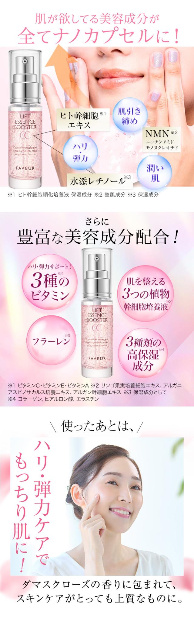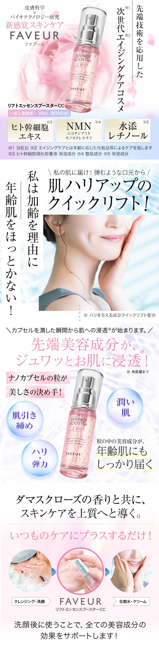 FAVEUR ファブール リフトエッセンスブースターCC 導入美容液 19ml ダマスクローズの香り NMN ヒト幹細胞エキス レチノール 配合 送料無料 ナノ化カプセル ビタミンC ビタミンE ビタミンA コラーゲン ヒアルロン酸 エラスチン 高保湿 引き締め 潤い 乾燥 ハリ 弾力ケア