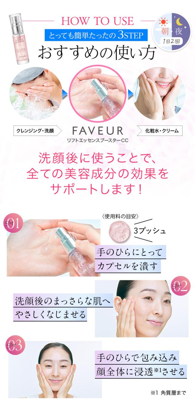 | ご使用方法 | 洗顔後(約3プッシュ)手のひらにとりカプセルを潰し、優しく肌に馴染ませる。 手のひらで包み込むように顔全体に浸透させる。 |