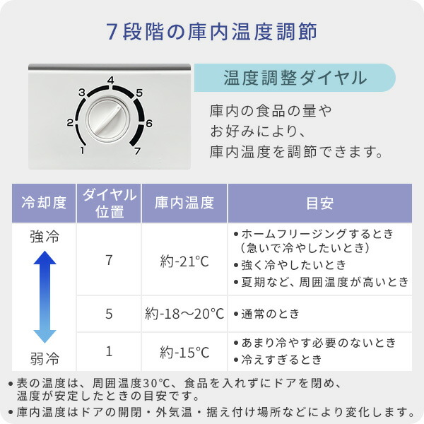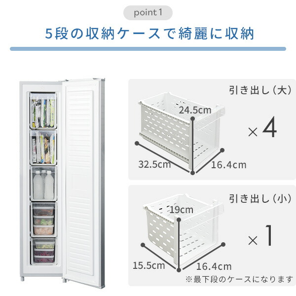 | 商品説明 | ●電源:AC100V(50/60Hz) ●年間消費電力量(50/60Hz):182kwh/年 ●定格内容積:90L ●運転音:35dB静音設計 ●省エネ達成率:100% ●キャスター付きで移動も楽々 ●5段引き出しタイプ ●R600ノンフロン設計 ●幅33.5cmとスリムなので置き場所を選ばない ●冷凍室のスペースのお悩みを解決 ●電源コードの長さ:1.8m ●直冷式なので手動で霜を取りの必要があります ●メーカー保証:1年 |
