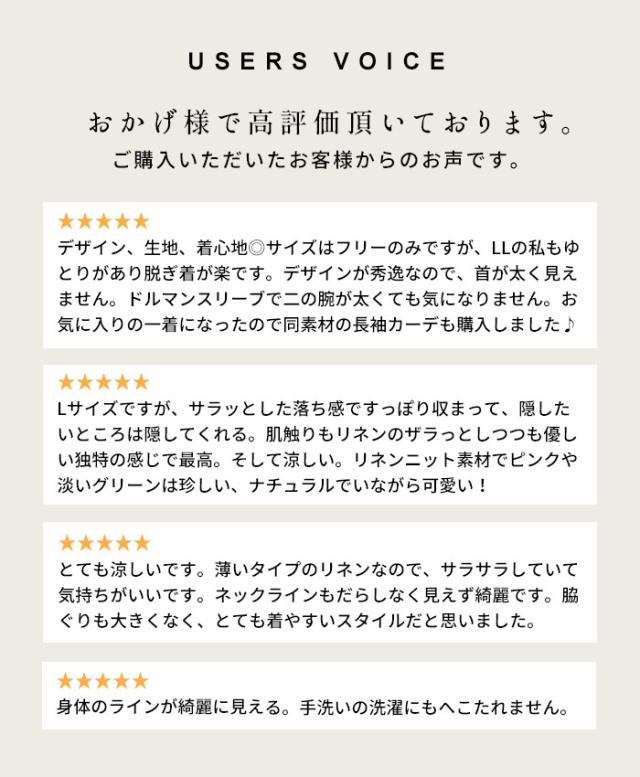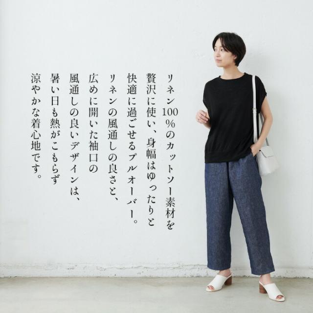特徴 程よくゆるく、涼しい。大人の夏服。リネン100%のカットソー素材を贅沢に塚い、身幅はゆったりと快適に過ごせるプルオーバー。リネンの風通しのよさと、広めに開いた袖口の風通しのよいデザインは、暑い日も熱がこもらず涼やかな着心地です。