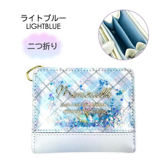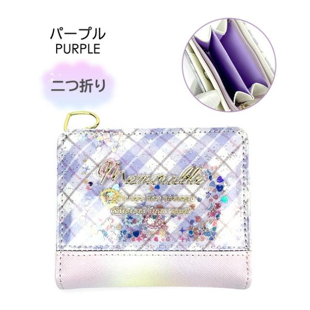 キラキラスパンコールやパール調ハートパーツが入った可愛い二つ折り財布。