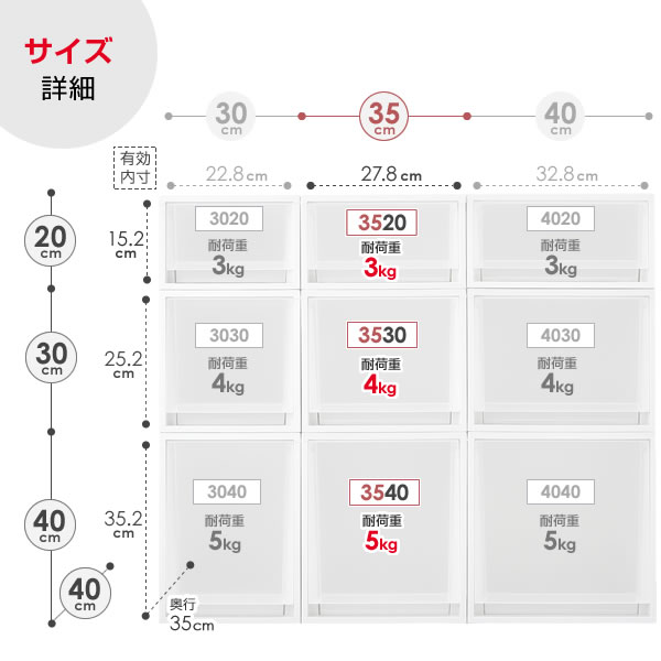 1個あたり外寸サイズ(約):3520/幅35×奥行40×高さ20cm 3530/幅35×奥行40×高さ30cm