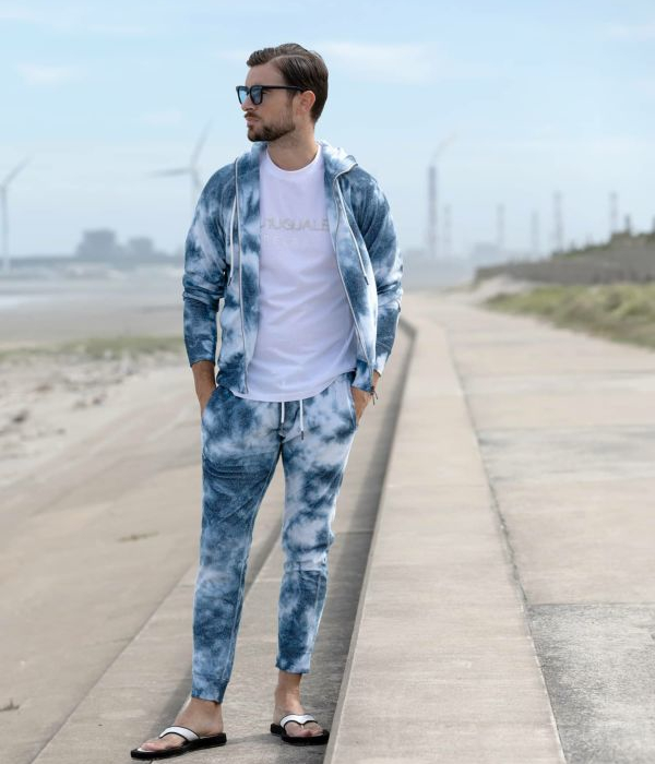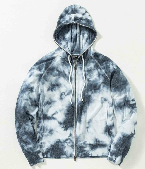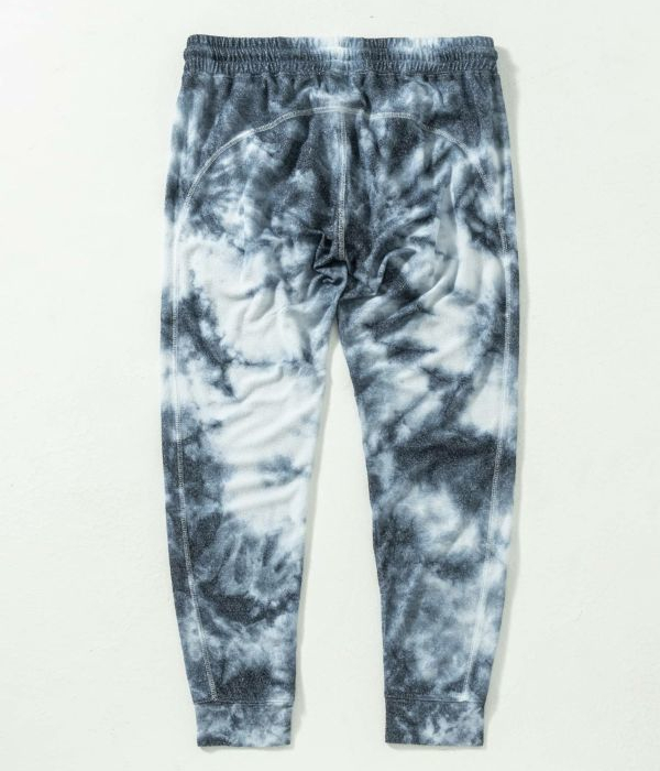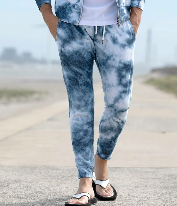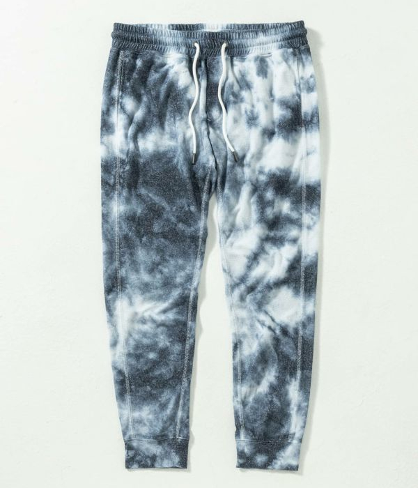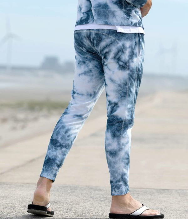 ややシャリ感のあるパイル素材を採用したセットアップ。インディゴとホワイトのタイダイ柄がシーズンらしい爽快感を演出。