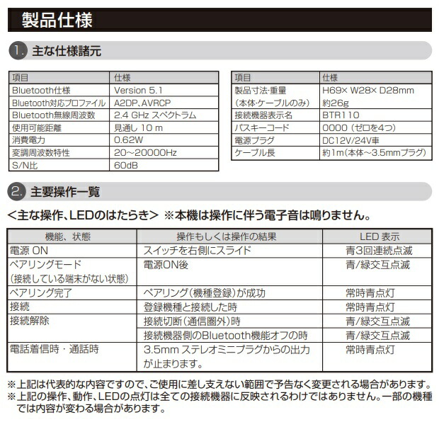 BTR110 Bluetooth AUXレシーバー 12/24V車 専用 セイワ SEIWA BTR-110【お取り寄せ商品】カー用品 レシーバー 音楽