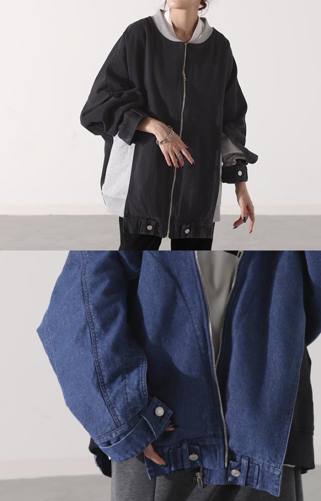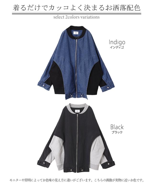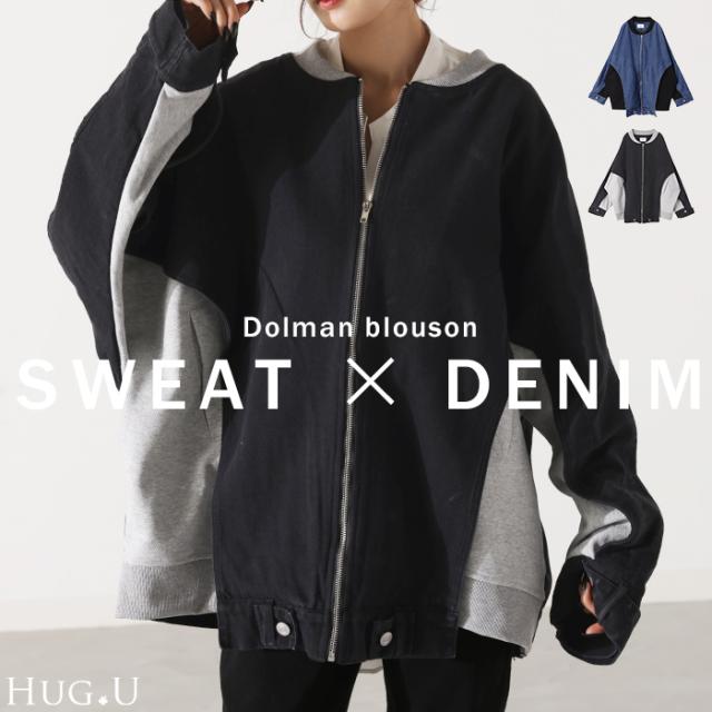 ブルゾン 異素材MIX デニム スウェット Gジャン アウター デニムジャケット レディース オーバーサイズ トレーナー デニムシャツ デニム トップス ジャケット アウター 防寒 大きいサイズ 長袖 羽織 ゆる ダメージ ジーンズ 体型カバー 春 冬 HUG.U 秋新作