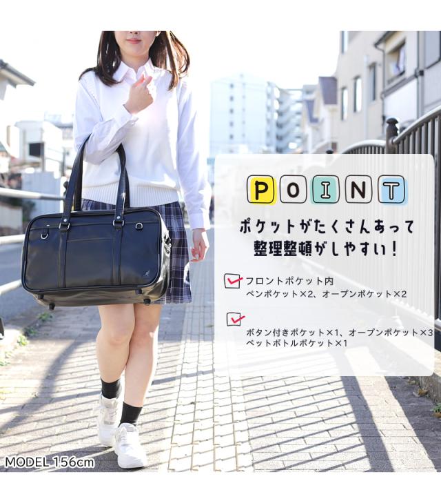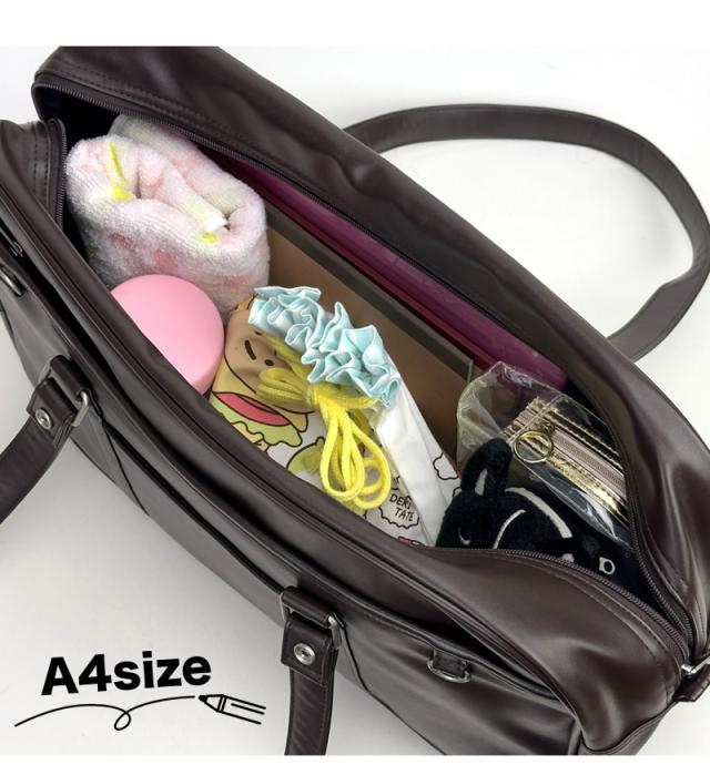 合成皮革を使用したシンプルなデザイン。パスケース等を取り付ける時に便利なDカン付き。底にはコーナーガードや底鋲がついており、擦れや汚れからバッグを守ります。メインルームは教科書やノート、A4ファイルなどもしっかり入るから、授業が多い日にもきちんと対応。底板付きでお弁当や教科書もたっぷり収納で安心♪フロントのファスナーポケットはケータイ、ペン、手帳など収納するのにベンリなポケットが付いています。持ち手が長めでゆったりと肩に掛けられます。通学用にはもちろん、部活、塾通い、お稽古事などいろいろなシーンで適用します。合格祝いや入学祝いのプレゼントにも最適!