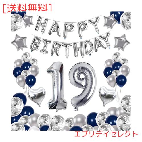 【セット内容】?「19」バルーン ?「HAPPY BIRTHDAY」ホイルバナー ?ハート風船×4 ?星風船×4 ?シルバー風船×12 ?ブルー風船×12 ?紙吹雪風船×12 ? 空気ポンプ×1、ドット状両面テープ×2、銀色リボン×2