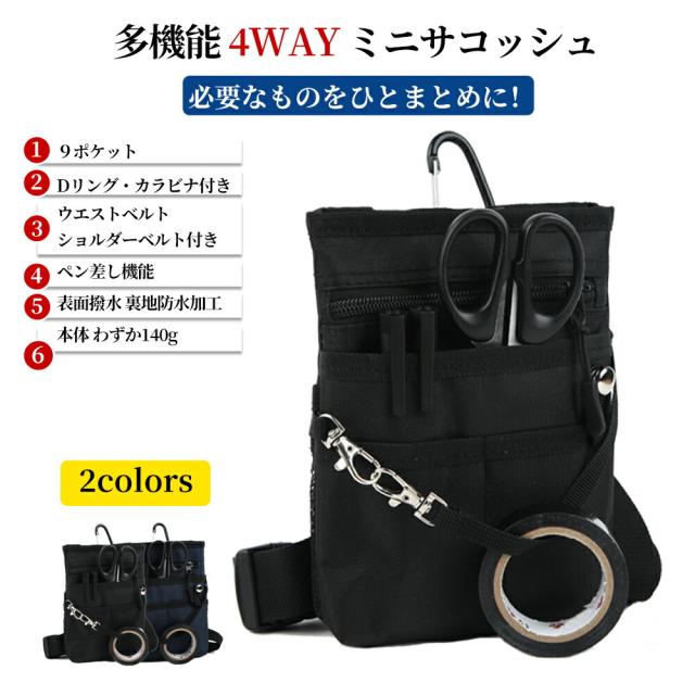 4WAY ミニサコッシュ Sサイズ カラビナ ベルトポーチ ミニショルダー スマホポーチ シザーバッグ ナースポーチ ウエストポーチ 作業ポーチ 事務 看護 介護 腰袋 スマホ2台持ち A6ノート 6.8 インチ対応 ウエストベルト ショルダーベルト付き 撥水 防傷加工