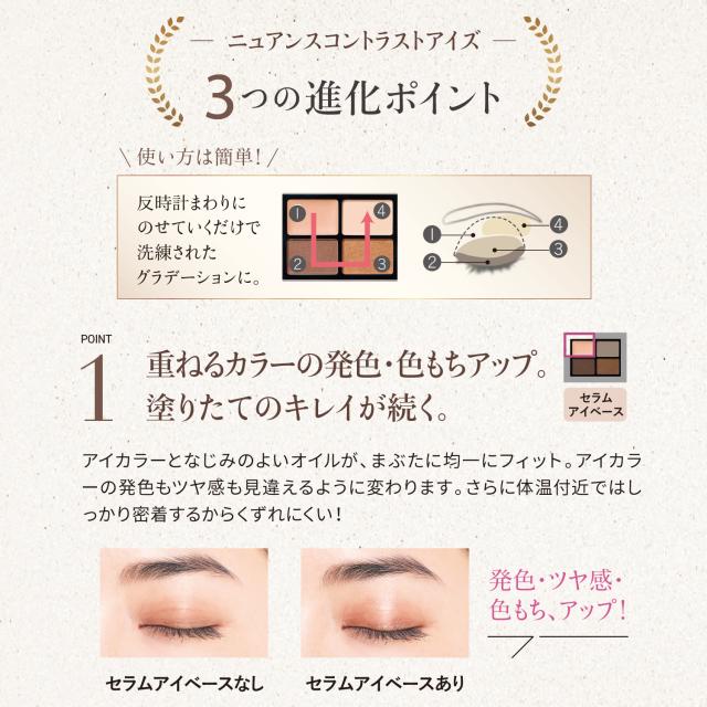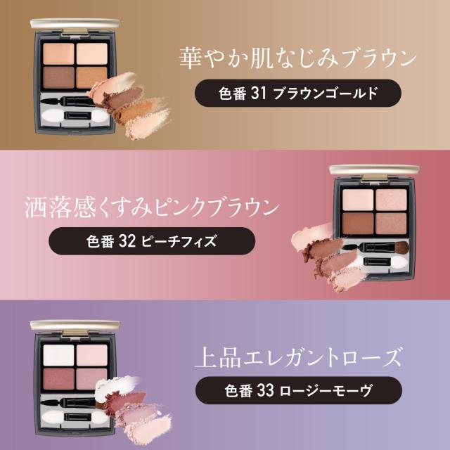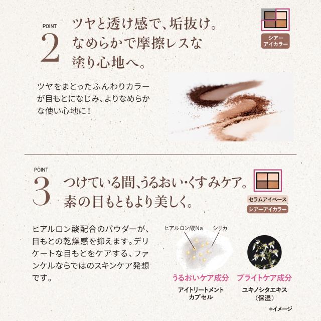 やわらかな質感の目もと用下地と3色のアイカラーで、シアーで印象的な目もとに仕上げるアイパレット。4色のグラデーションで、ツヤと透け感のある洗練された大人の目もとに。さらに美容液成分配合で、素肌をキレイに魅せて育むアイカラーです。