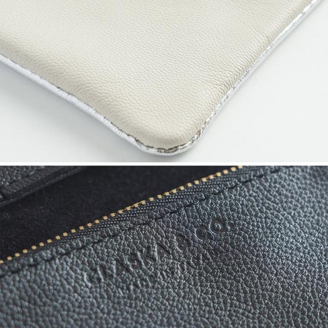 革の表側の控えめな艶と、裏側のマットな質感の対比がシックな雰囲気を演出。ブラックは同色ですが、シルバーは内側の革がやさしい白になっているのも特徴です。内側に"CLASKA&CO."と"MADE IN JAPAN"の文字を型押ししているなど、こだわりぬいたデザインをお楽しみいただけます。