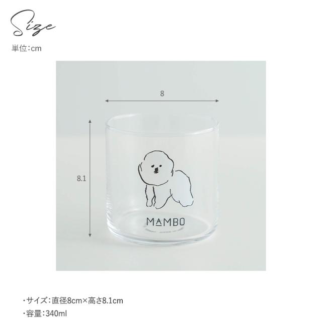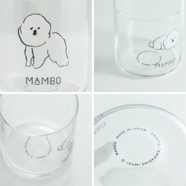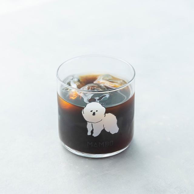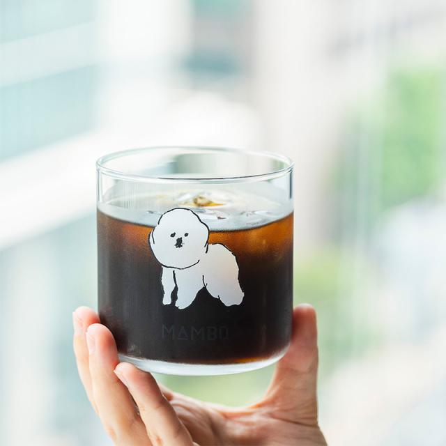 イラストレーター 塩川いづみさんの描いた「ビション・フリーゼ」がモチーフの、人気のMAMBOシリーズにシンプルなデザインのグラスが登場。グラスの中央には、つぶらな目鼻がたまらなく愛らしいMAMBOのイラストがあり、使うたびに癒してくれそうです。